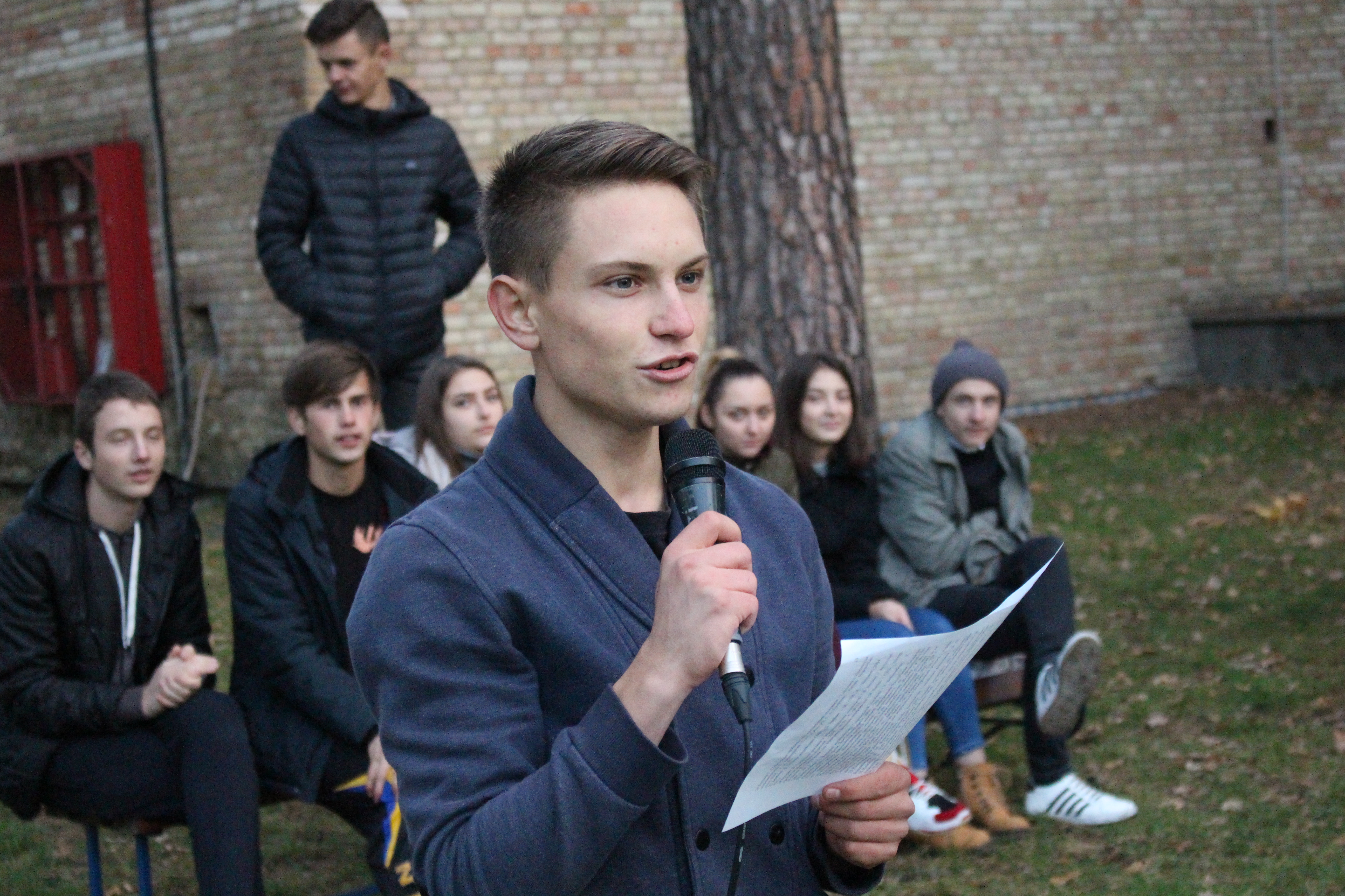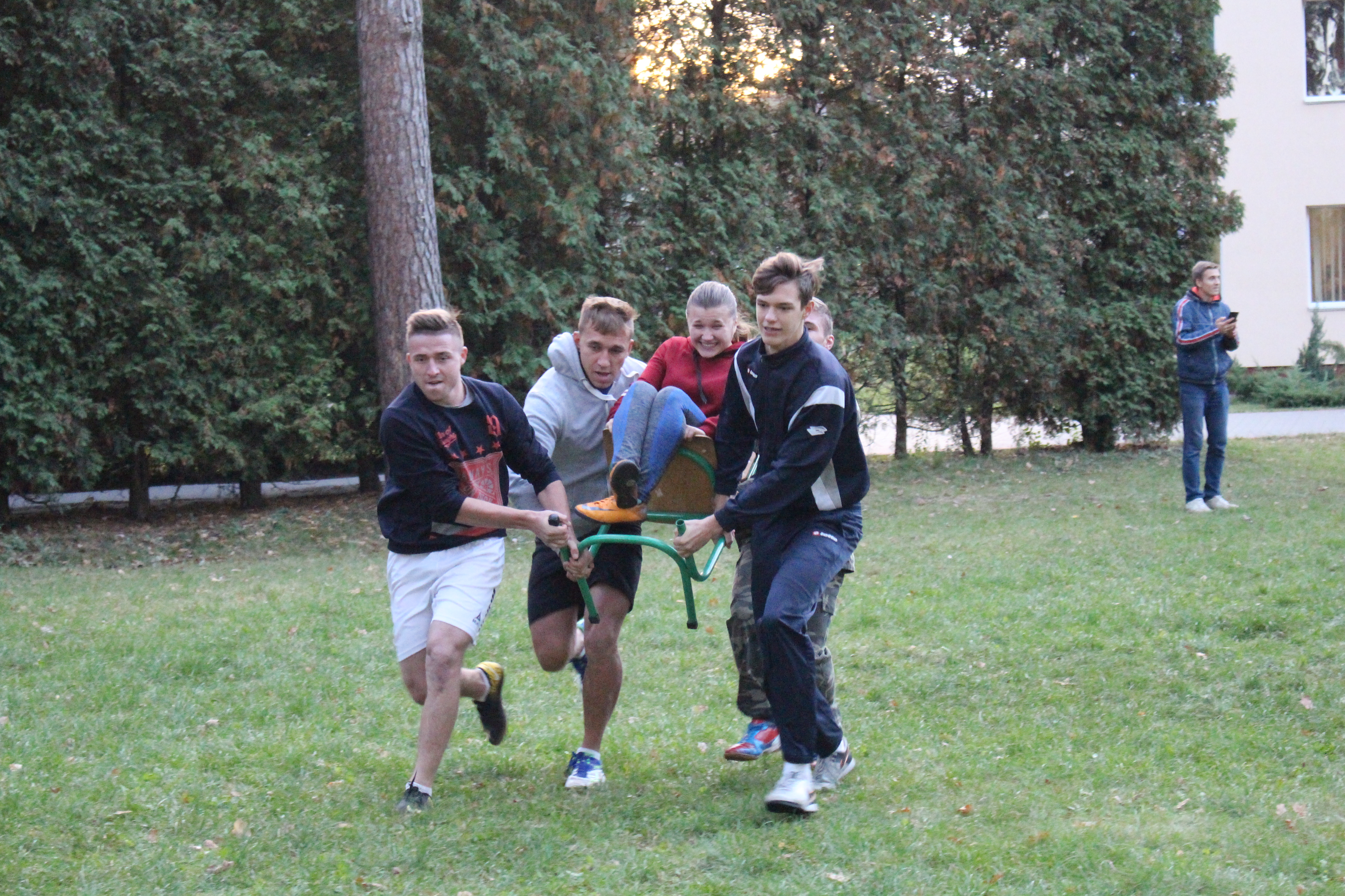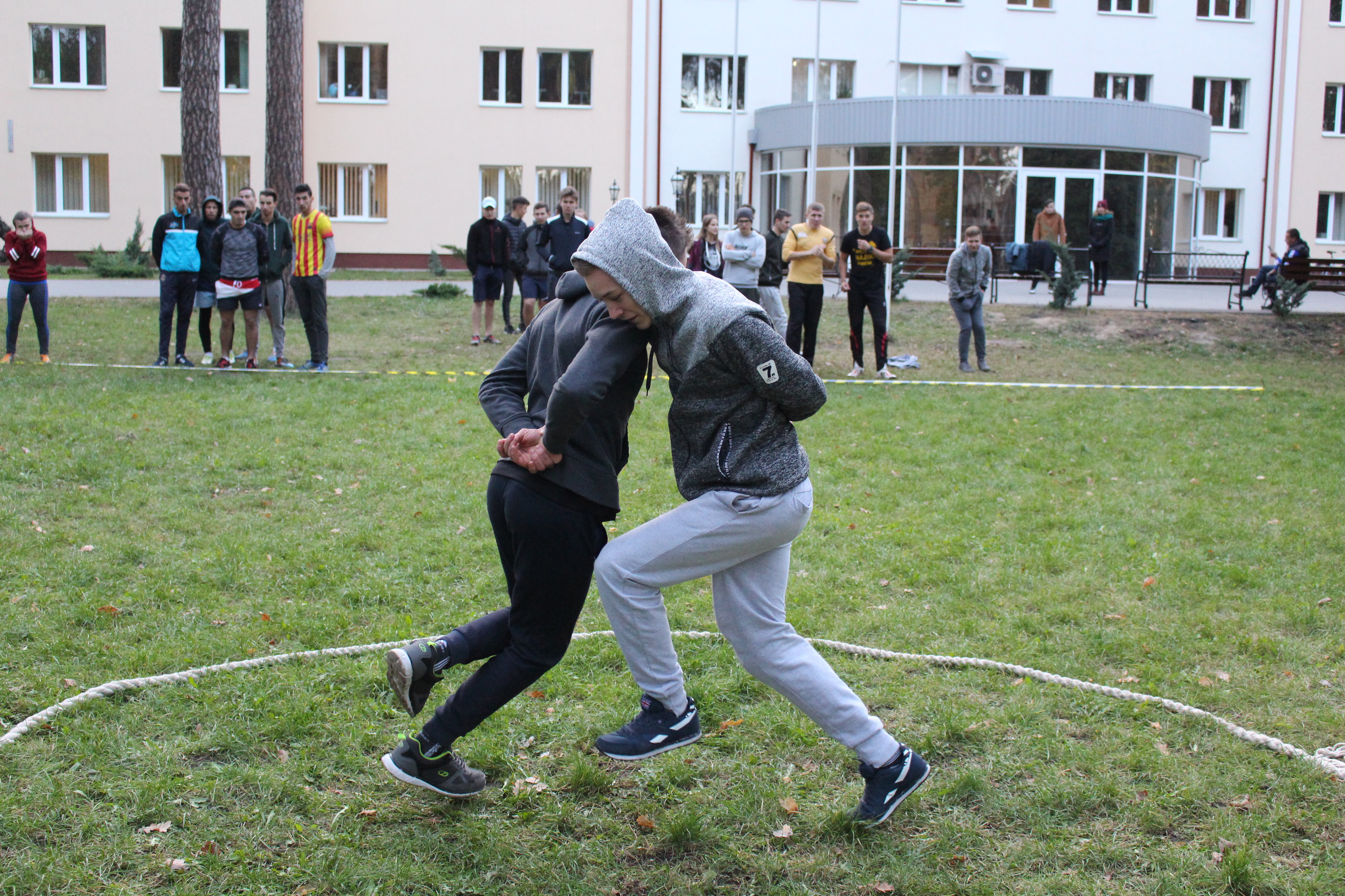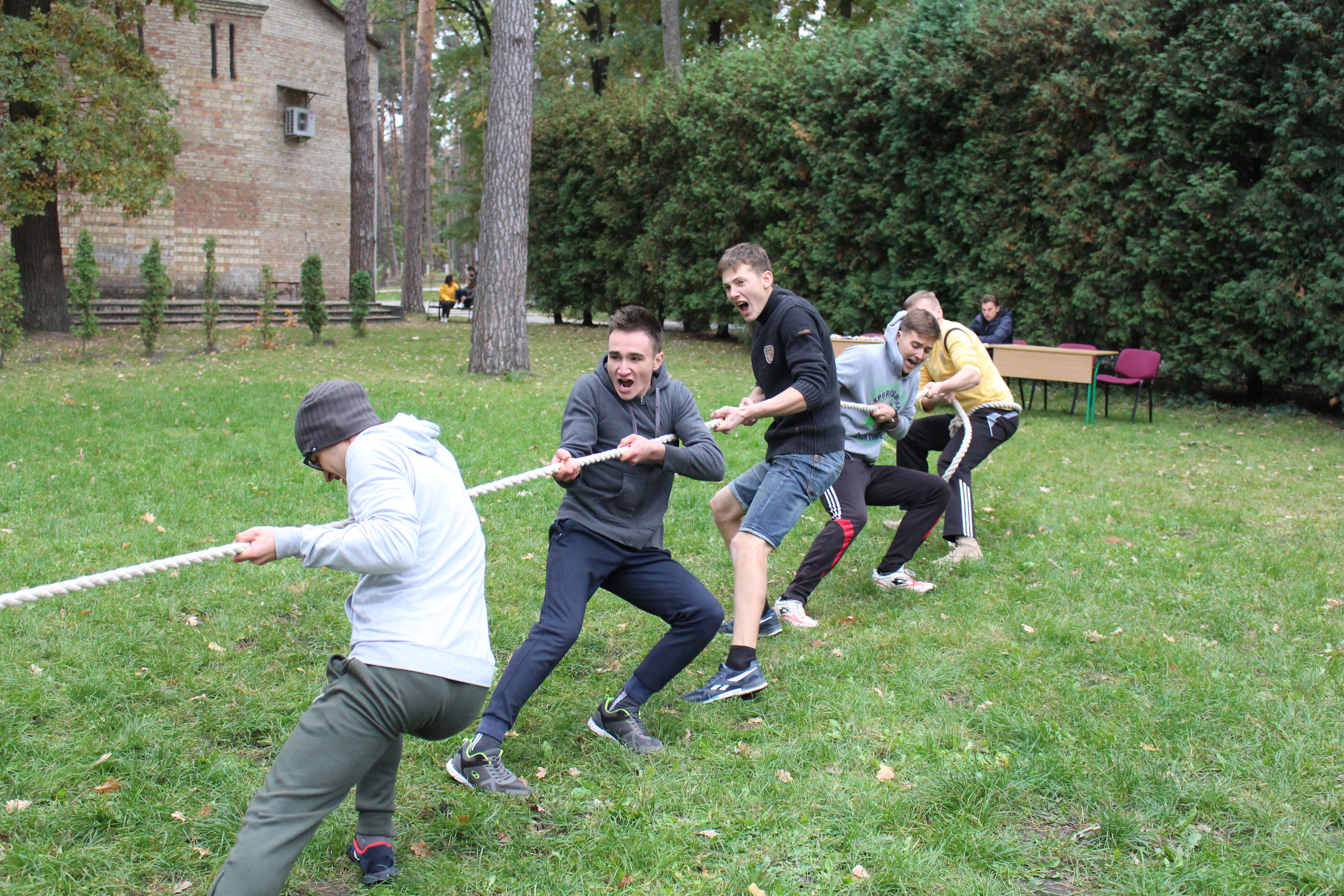 На зеленому газоні перед адміністративним корпусом, незважаючи на холод, зібралися 5 команд. В кожній команді було по п’ять хлопців та по одній дівчині.