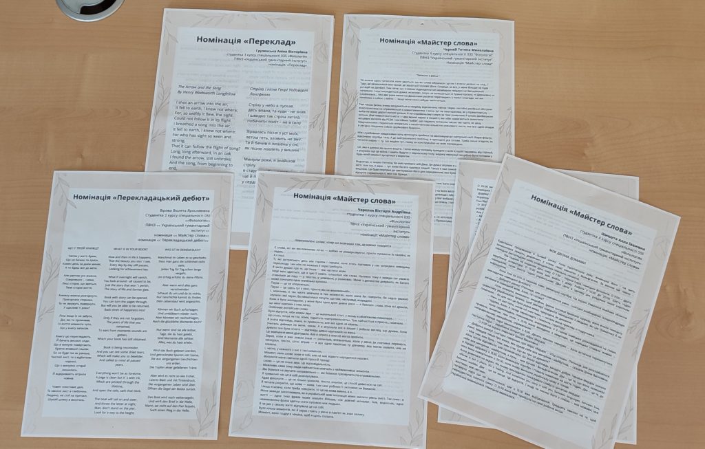 Студентки Аліна Грузенська та Віолетта Вірова взяли участь у номінації “Переклад”. Пані Аліна подала переклад вірша Генрі Уотсфорда Лонгфелло “Стріла і пісня” українською з англійської, а Віолетта – “Що у твоїй книжці?” українською з німецької.